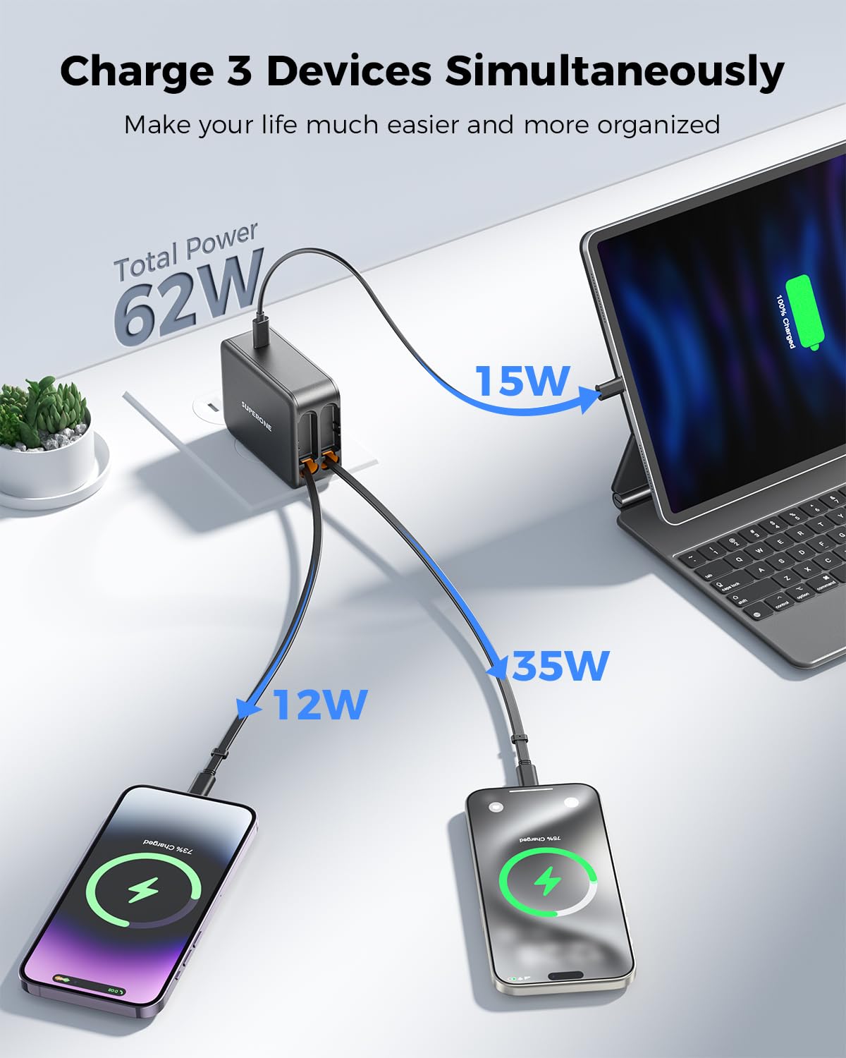 SUPERONE 62W Retractable Wall Charger with Dual Cables, 3-Port USB Charger Block, 35W iPhone Chargers Fast Charging for iPhone 17/16/15/14/13/12/11 Series, Pad, Tablet, LG, Samsung and More