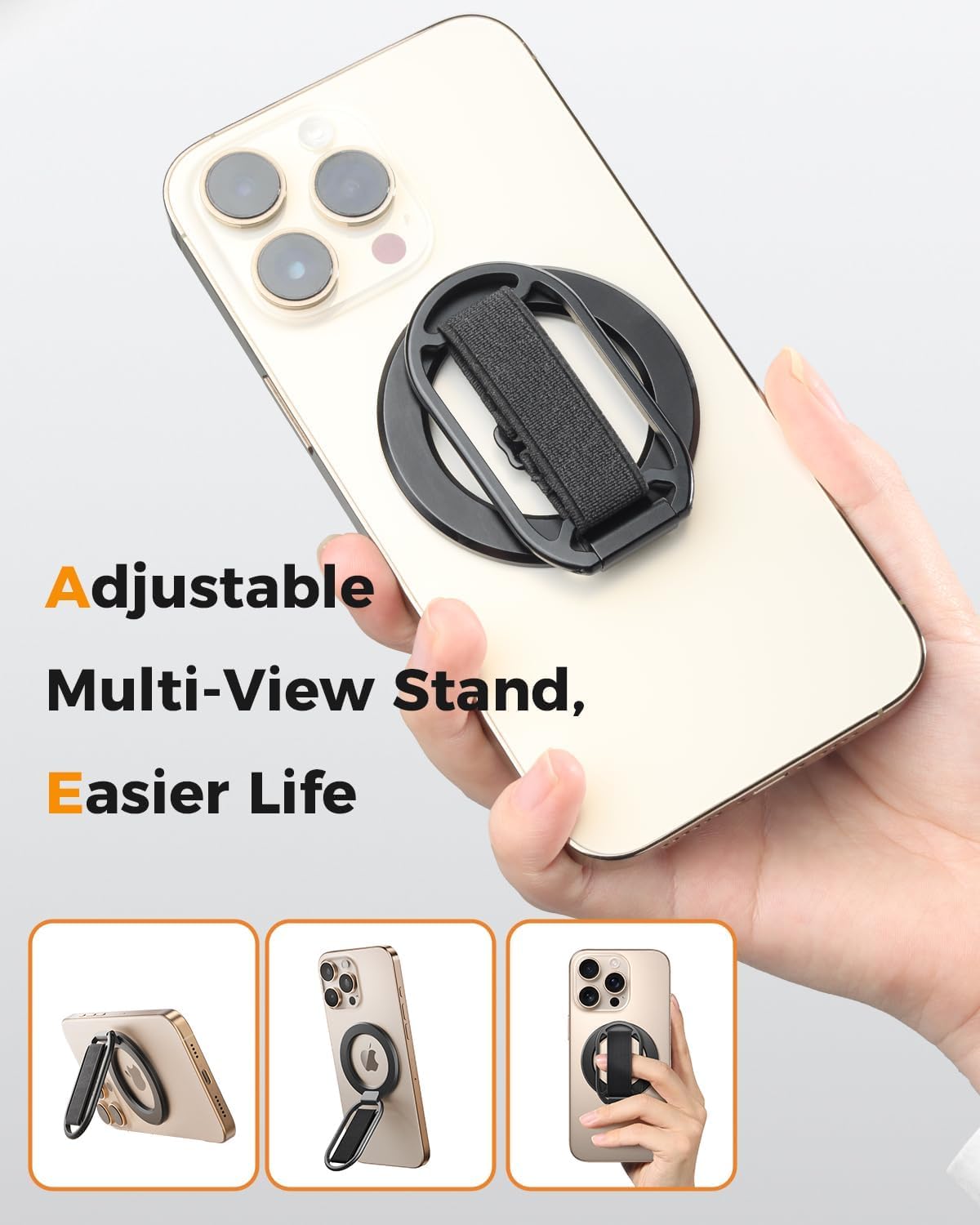 - [4-in-1 Multifunctionality] This all-in-one magnetic phone holder features a versatile foldable design. It functions as a magsafe ring, magsafe stand, magsafe grip, and magsafe strap, offering comprehensive and powerful capabilities to meet various needs in different scenarios. Enjoy a secure, comfortable, and convenient experience while using your phone with ease.