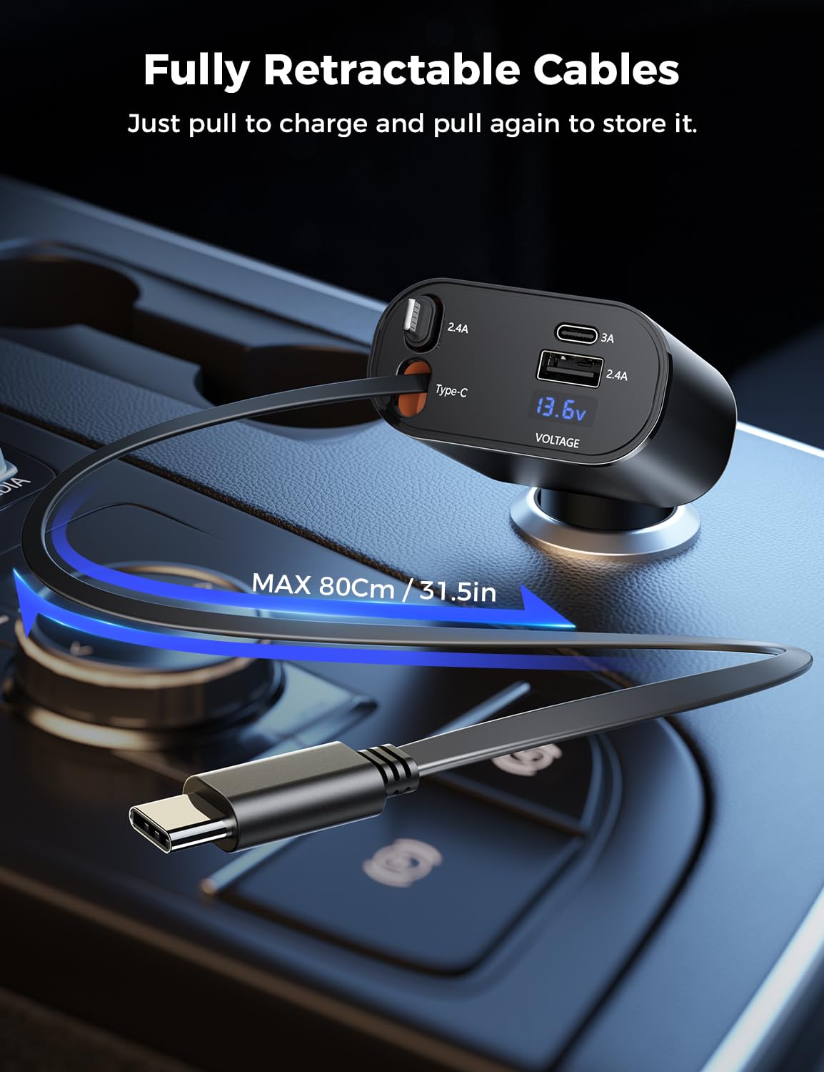 - ā”Retractable For Storageā”Featuring a retractable design, this retractable car charger comes with two 80cm retractable charger cords that automatically retract for easy storage. Say goodbye to cable entanglement and keep your car interior well organized.